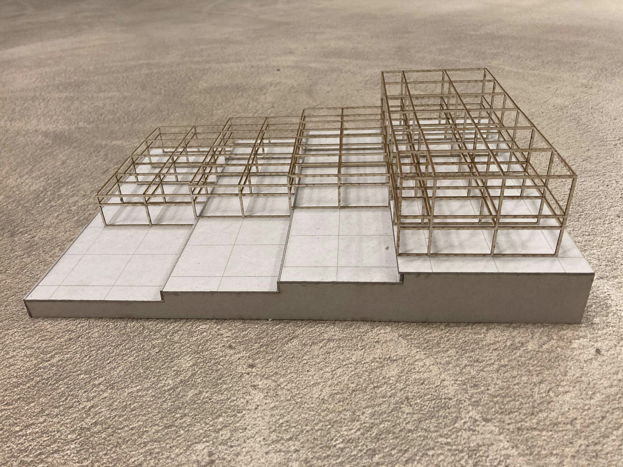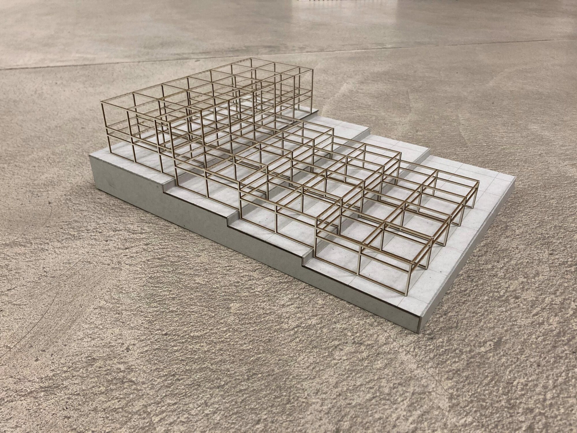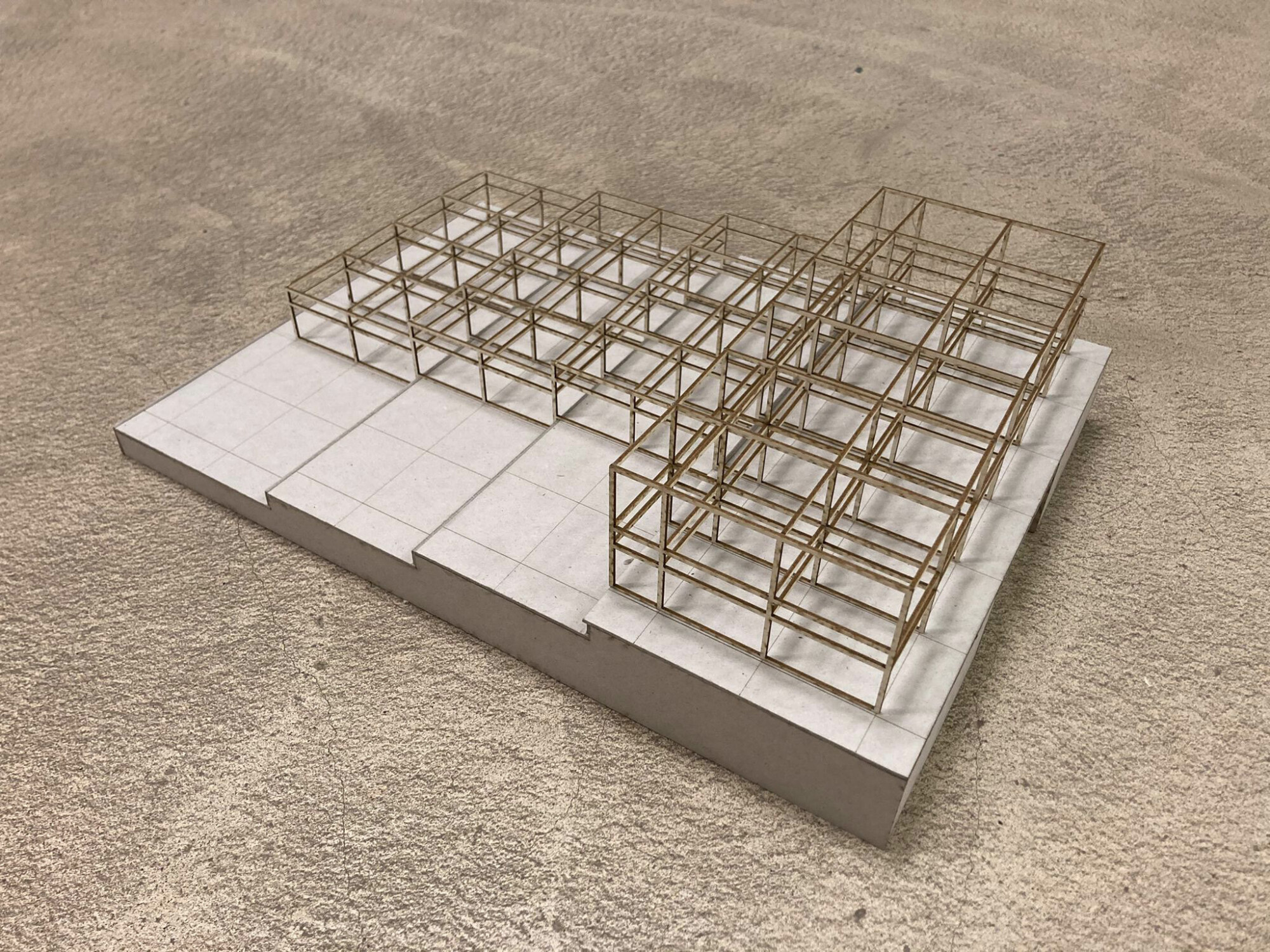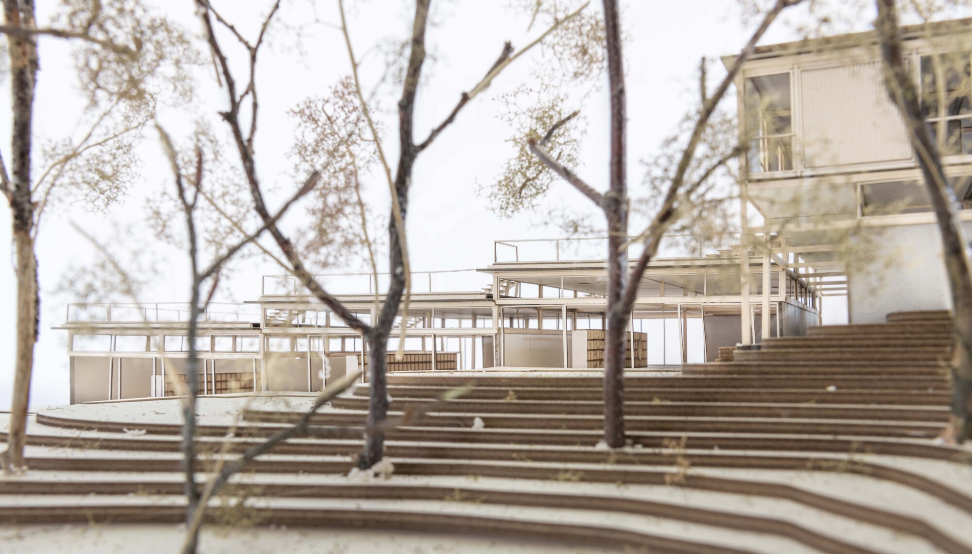 Das Volumen gliedert die drei Kindergärten und die Tagesbetreuung für 80 Kinder in vier Längskörper, die parallel zur Hangkante gestaffelt und in einer gridartigen Raumstruktur aus Holz zusammengebunden sind. Zum Schubertweg wird ein klarer Abschluss mit überdecktem Aussenraum als Adresse und Eingang ausgebildet und zum stark abfallenden Wald durch eine L-förmige Grundfigur ein geschützter Aussenraum definiert. Der oberste Baukörper überblickt zweigeschossig die anderen und beherbergt die Tagesbetreuung. Vom ersten Obergeschoss aus können die Dächer der eingeschossigen Kindergärten erschlossen werden. Der Kopfbau bildet einen Abschluss und gleichzeitig ein Anschluss des Kindergartenareals zum Sportplatz des Schulhauses Gerhalde. Im gesamten Erdgeschoss sind Oberlichter in alle vier Himmelsrichtungen angeordnet, was das Dach abhebt von den Wänden. Dadurch entstehen Sichtverbindungen, die aus der Gebäudestaffelung im Gelände abgeleitet sind sowie natürliche und künstliche Lichteinfälle in und zwischen den Räumen. Der Neubau rahmt und fasst im Nordosten durch die Gebäudeform und seine Positionierung einen geschützten, leicht terrassierten Gartenraum, der als Spielplatz dient.