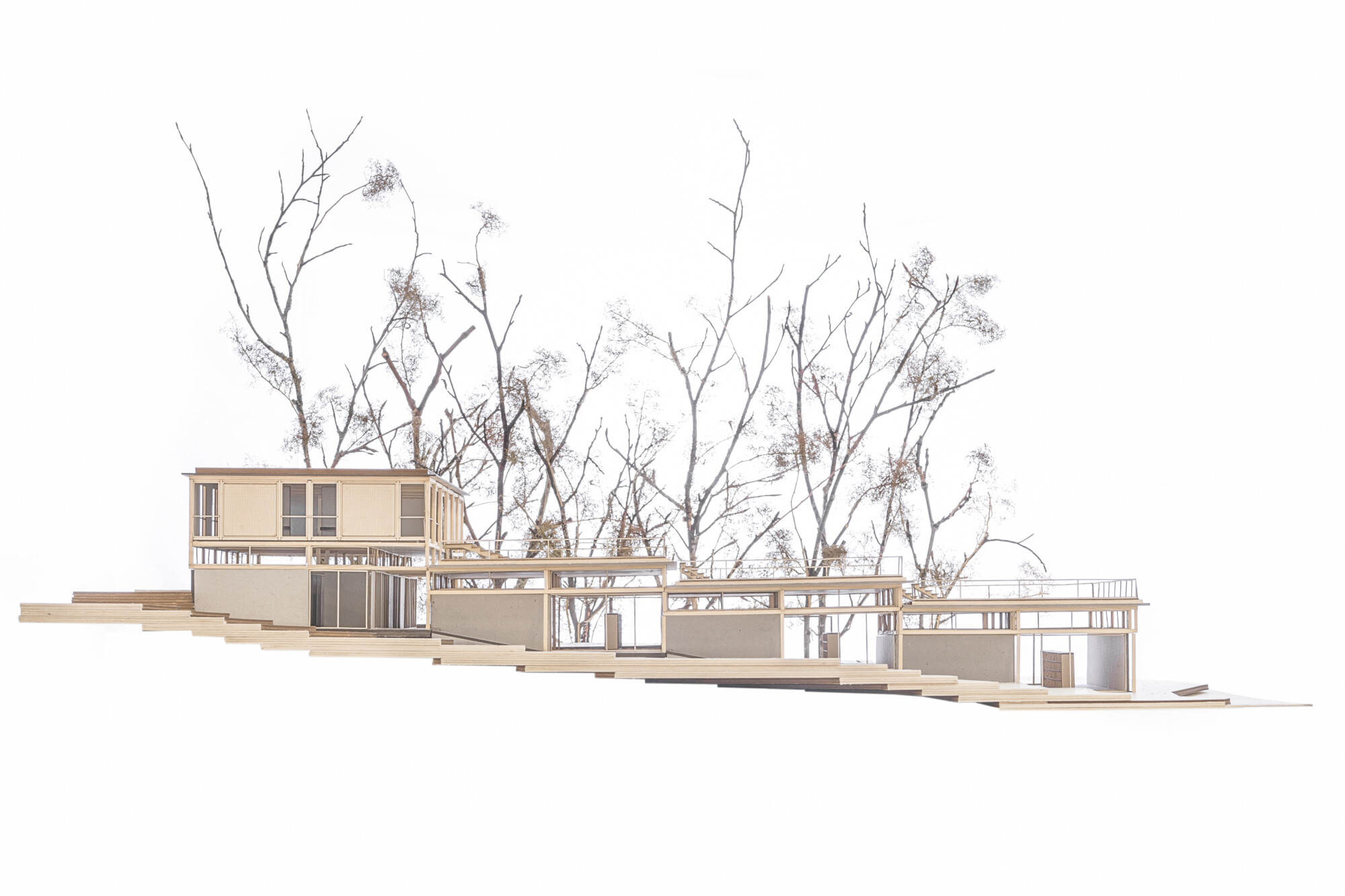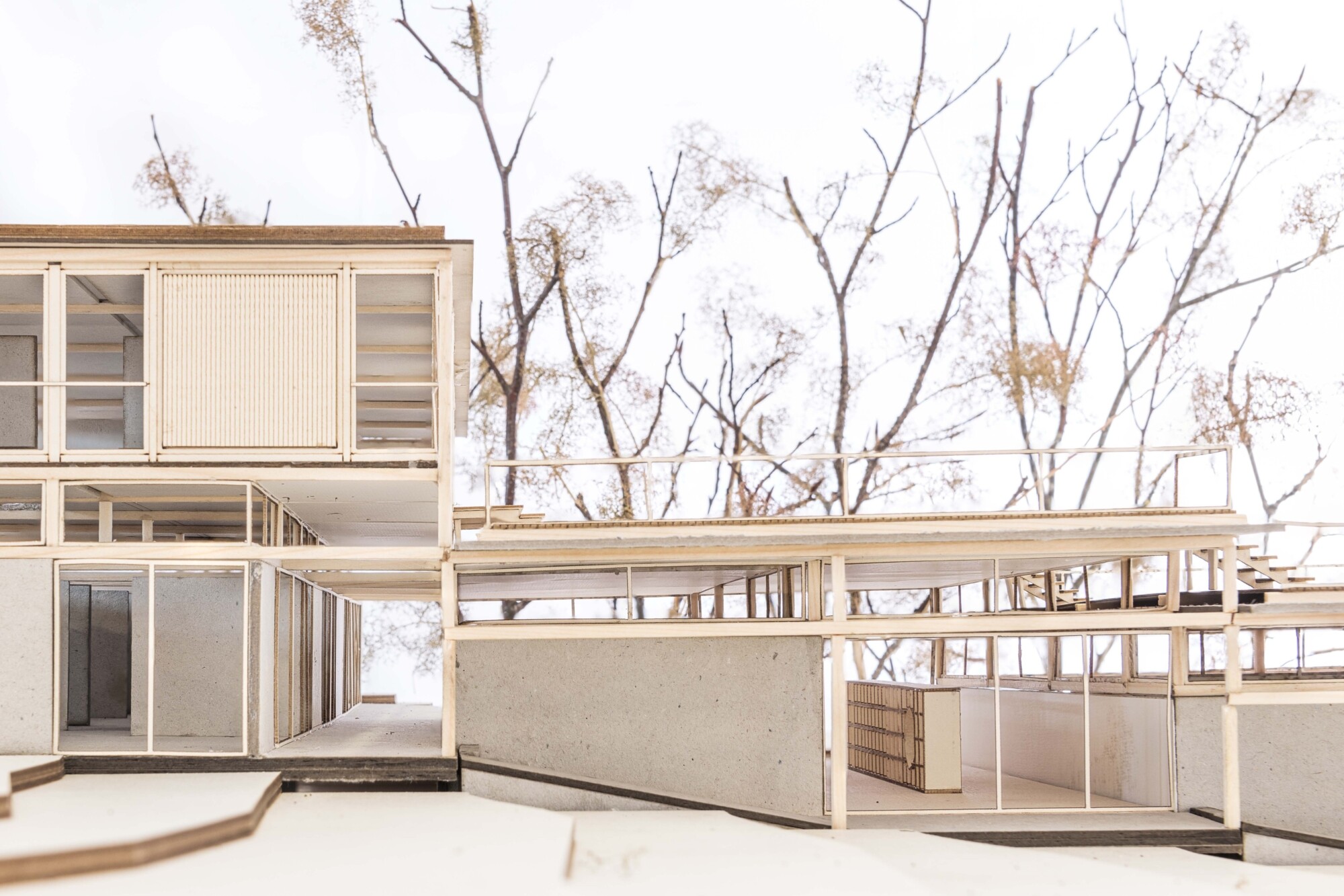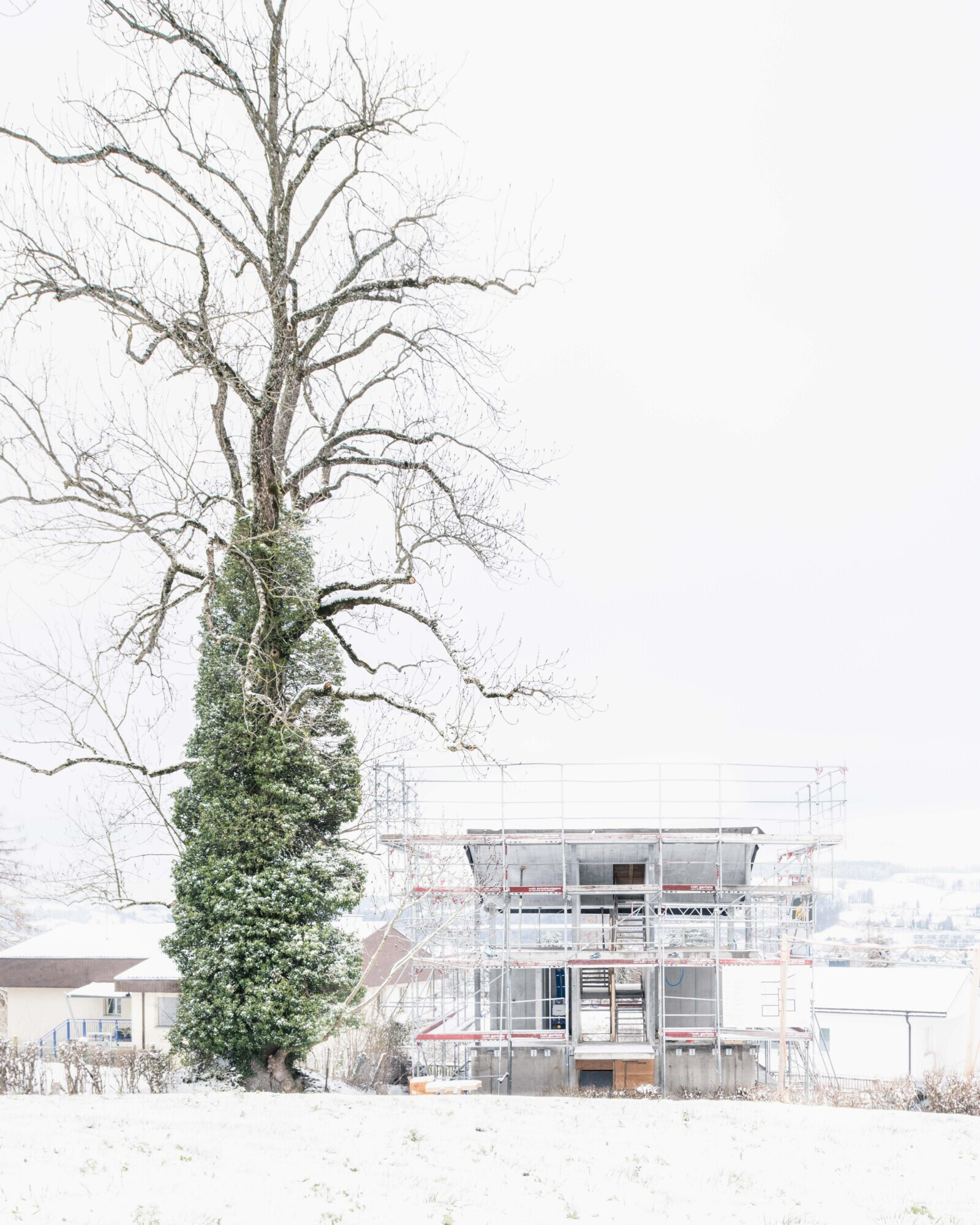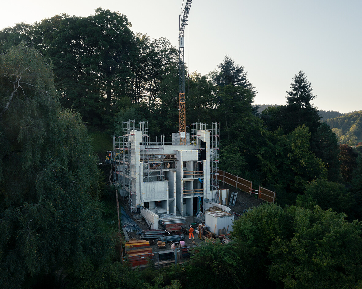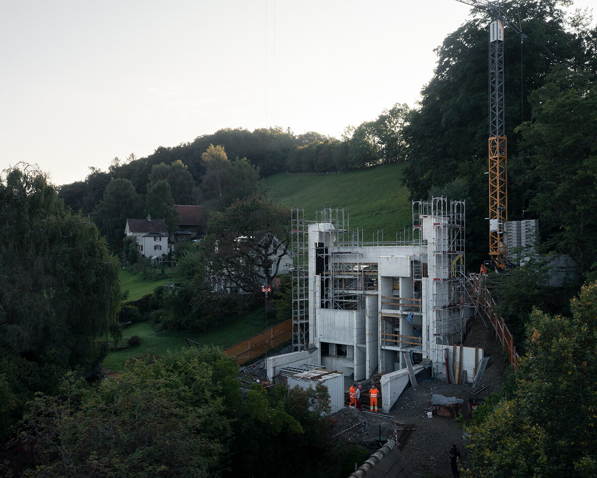 Das Grundstück liegt zwischen dem beliebten Naherholungsgebiet Drei Weihern und dem direkt angrenzenden Wald. Trotz exponierter Lage ist das Haus vom öffentlichen Raum aus kaum wahrnehmbar. Das frei im steilen Gelände stehende kubische Volumen entspricht in seiner Dimensionierung und Körnung den umliegenden Jugendstilbauten und wird über eine Privatstraße mit einer Brücke erschlossen. Talseitig tritt das Haus dreigeschossig in Erscheinung und folgt als Splitlevel dem Hang. Ein zentraler Kern und zwei markante Kamine erschließen die oberen, fließenden Wohngeschosse mit den Schlafräumen und dem darunterliegenden Gartenzimmer. Mit dem rückwärtigen Treppenhaus und separatem Zugang dient dieses auch als eigenständige Gästewohnung. Durch die Anordnung der Geschosse verfügt jeder Raum über einen direkten Zugang ins Freie. Die Struktur des Gebäudes gleicht der eines Baumes. Die Schornsteine sowie der massive Kern übernehmen die Funktion des Stammes, der im Erdreich verwurzelt ist und aussteift. Die daran aufgehängten Holz- und Stahlträger ermöglichen eine rundum öffenbare Fassade. Durch das reflektierende Glas, das dunkle Holz und die begrünten Pflanztröge tritt das Gebäude völlig in den Hintergrund.