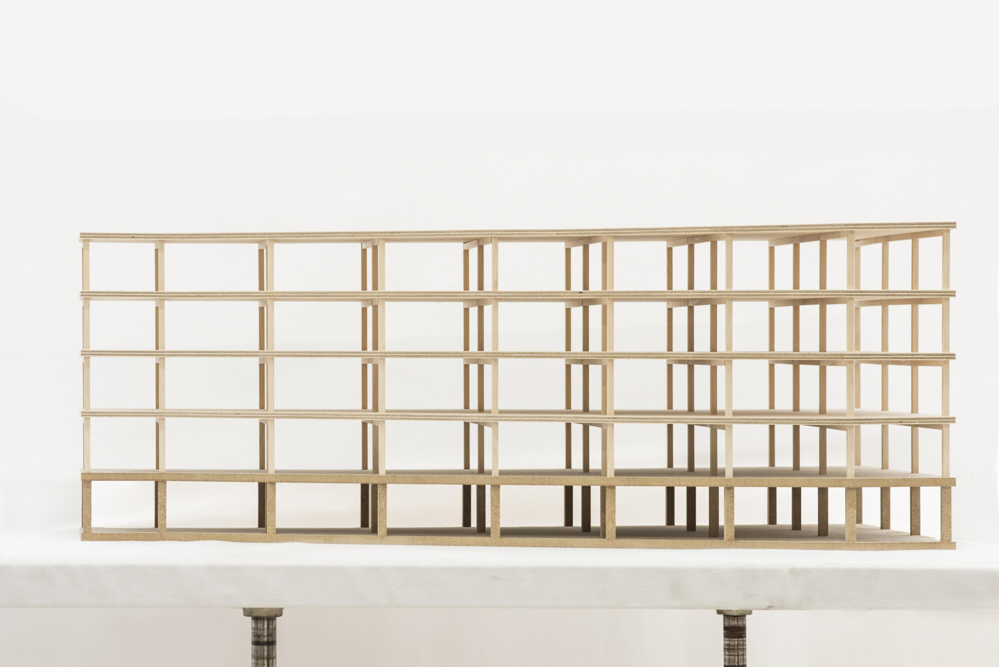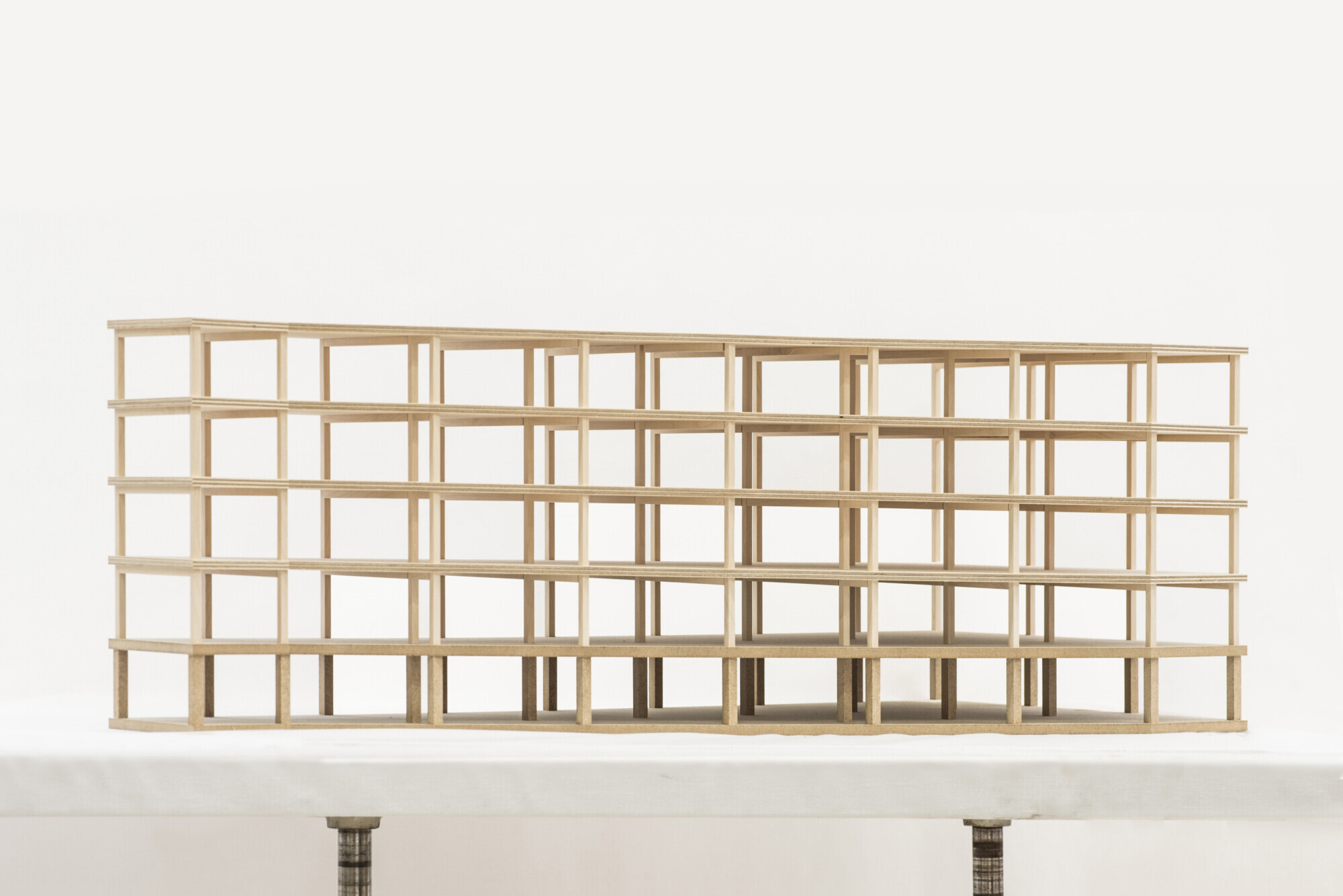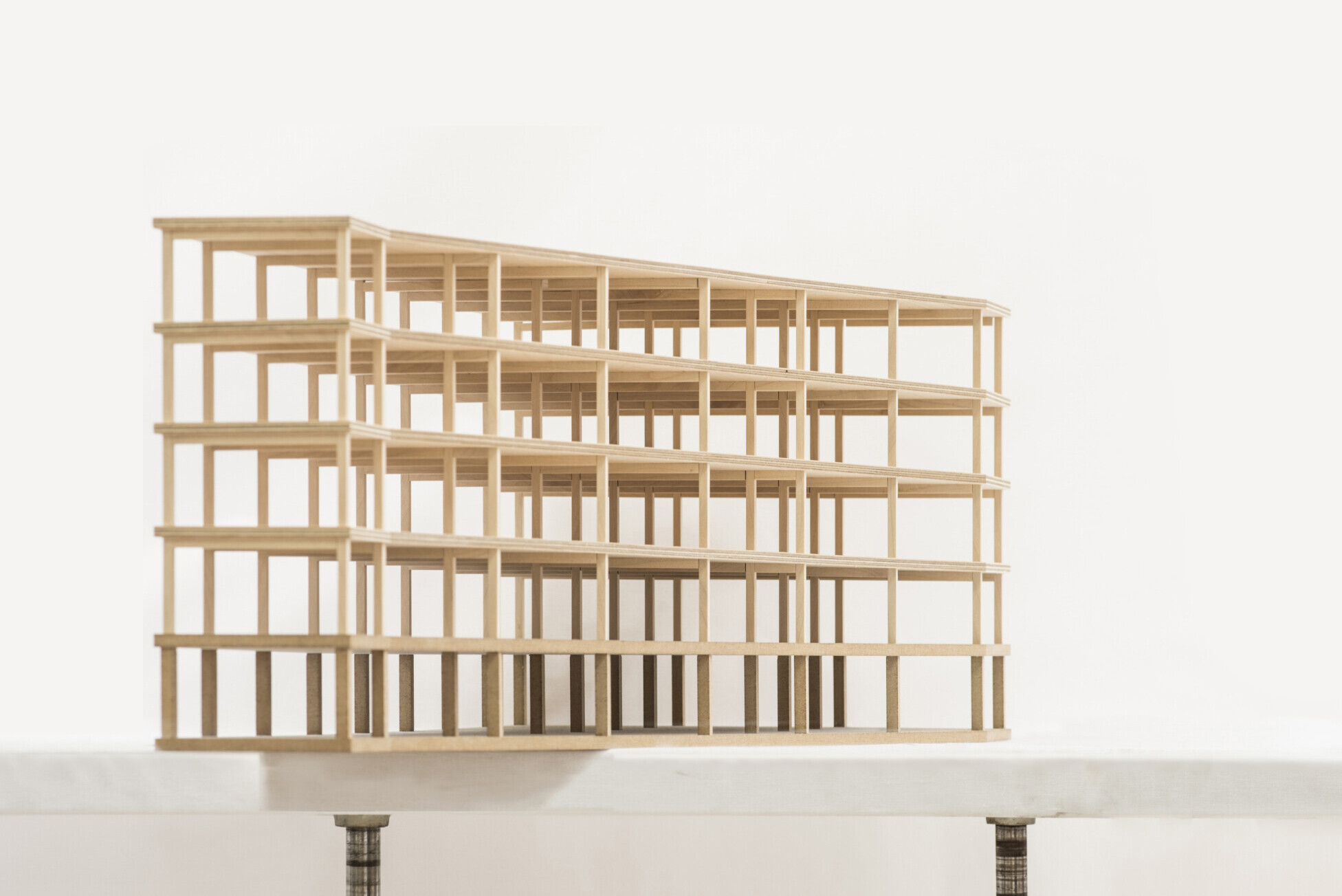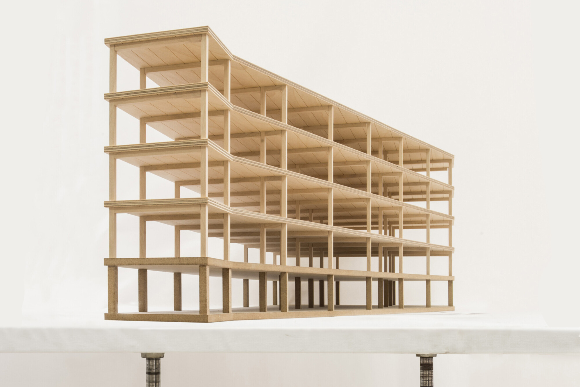 Der losgelöste Baukörper nimmt die Fluchten der Nachbarbauten rundum auf, weicht mit leichtem Knick vom Strassenverlauf zurück und tritt so schlank und feingliedrig, zweiteilig in Erscheinung. Die Einstellhalle des Strasseninspektorates wird von einer mehrgeschossigen Holzkonstruktion überspannt. Einem dreidimensionalen Raumgitter gleich, lässt die flexible Konstruktion unterschiedlichste Wohnungstypen zu. Zusätzlich ermöglichen Schaltzimmer eine schnelle Reaktion auf Veränderungen am Markt. Die so entstehende Vielfalt fördert die gewünschte soziale und demografische Durchmischung. Von Studios, Maisonettes mit Schaltzimmern, Durchwohnen auf die Laubengänge, bis hin zu grosszügigen, vierseitig belichteten Familienwohnungen nehmen die Grundrisse alles auf, oder können in der flexiblen Struktur entsprechend angepasst werden. Der gemeinsame Innenhof bildet das identitätsstiftende Zentrum der Anlage. Erschliessung, Filter und Aufenthaltsort in einem, wird er zum wichtigen Interaktionsraum der Siedlung. Neben der kühlenden und wasserspeichernden Funktion ist das sich ständig verändernde Beet mit unterschiedlich blühenden Blumen, Gräsern, Sträuchern und kleinen Bäumen auch optisch eine erfrischende Aufwertung, die zusätzlich zum Verweilen auf der langen Bank einlädt.